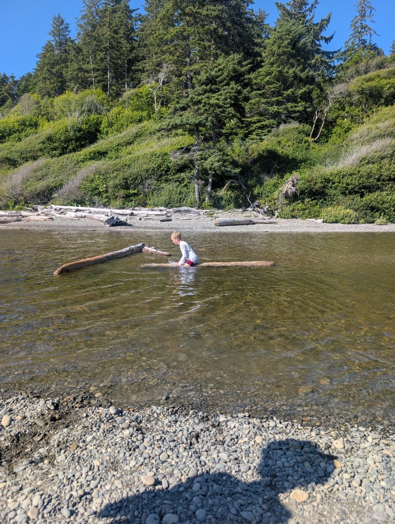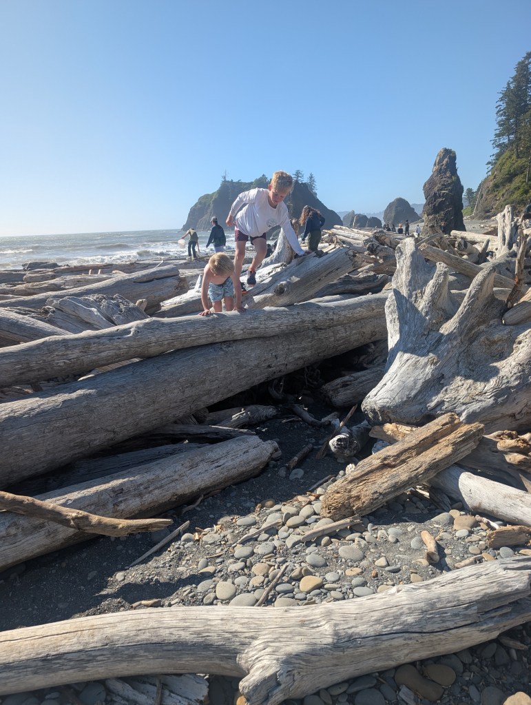 We decided to leave after playing at the park for an hour or so and stopped at Ruby Beach on the way back to camp. It was a super cool beach covered in pebbles and massive amounts of driftwood. It was an obstacle course of trees to get down to the ocean, and the ocean had these beautiful jutting rocks. The waves were huge, and the kids had so much fun playing in them. It was definitely chilly, though, as it was back down to high sixties.